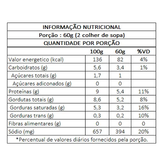 Creme de leite, massa coalhada (leite desnatado e acidulante ácido lático), requeijão cremoso, condimento preparado cebola e salsa [especiarias (cebola e salsa), água, sal, extrato de levedura, aromatizante, corante natural clorofila e conservante sorbato de potássio], leite em pó desnatado, amido modificado, cloreto de sódio (sal), sais emulsionantes polifosfato de sódio, difosfato tetrassódico, difosfato dissódico e fosfato trissódico e conservante sorbato de potássio. ALÉRGICOS: CONTÉM DERIVADOS DE LEITE. CONTÉM LACTOSE. NÃO CONTÉM GLÚTEN.