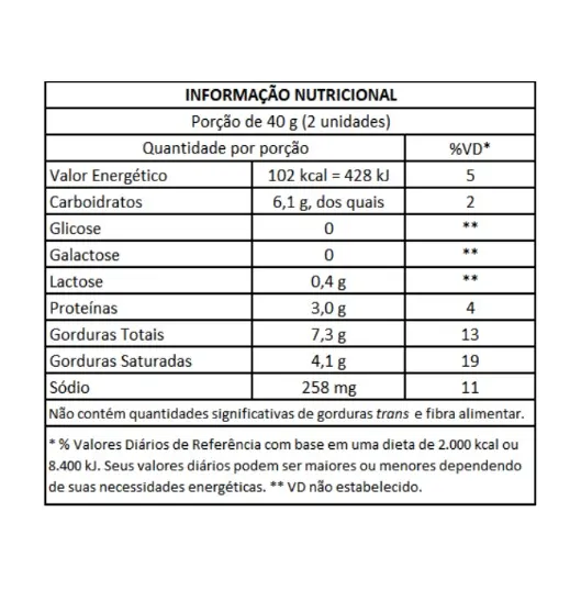 Água, polvilho, gordura vegetal de palma, ovo , líquido integral, leite integral em pó, queijo minas padrão,queijo parmesão, fécula de Mandioca, requeijão cremoso, amido de mandioca modificado e cloreto de sódio (sal). Alérgicos: contém ovo e derivados de leite. PODE CONTER SOJA. CONTÉM LACTOSE. NÃO CONTÉM GLÚTEN