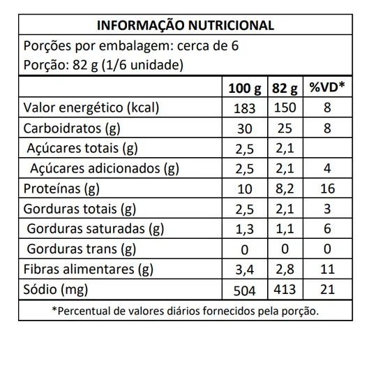 salsa desidratada, sal e pimenta preta moída), água, requeijão cremoso, molho de tomate, queijo mussarela, cloreto de sódio (sal), fermento fresco e óleo de girassol.