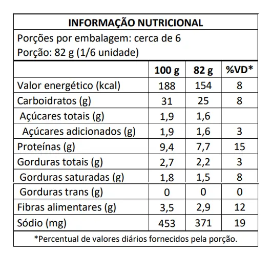Farinha de trigo enriquecida com ferro e ácido fólico, água, queijo mussarela, requeijão cremoso, molho de tomate, tomate cereja, cloreto de sódio (sal), fermento biológico fresco, manjericão e óleo de girassol. ALÉRGICOS: CONTÉM DERIVADOS DE TRIGO E LEITE. PODE CONTER OVOS, SOJA, AVEIA, CENTEIO, CEVADA, TRITICALE E NOZES. CONTÉM GLÚTEN. CONTÉM LACTOSE.