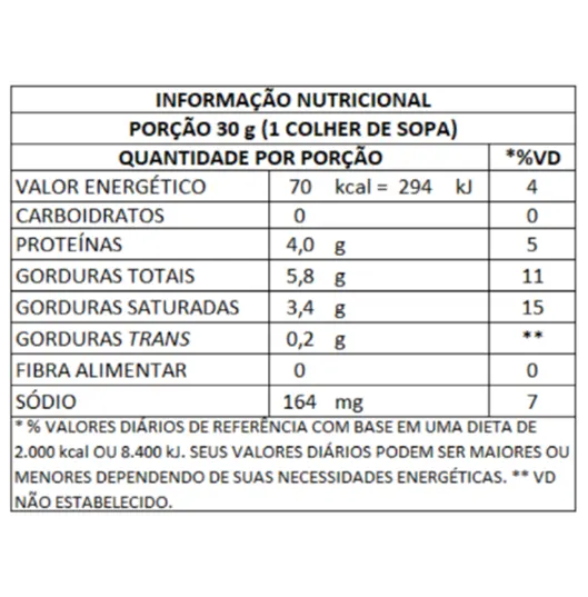 Requeijão Cremoso (Creme de Leite, Massa Coalhada, Cloreto de Sódio (Sal), Estabilizante Pirofosfato Tetrassódico e Regulador de Acidez Bicarbonato de Sódio), Carne bovina seca desfiada (Carne Bovina, Sal, Açúcar, Nitrito e Nitrato de Sódio, Tripolifosfato de Sódio, Pirofosfato de Sódio e Aromas Naturais), Cebola, Salsinha, Azeite de Oliva, Alho, Cloreto de Sódio (Sal) e Pimenta-do-reino. ALÉRGICOS: CONTÉM DERIVADOS DE LEITE. PODE CONTER SOJA, TRIGO, CENTEIO, CEVADA, AVEIA, AVELÃ, CASTANHA-DE-CAJU, CASTANHA-DO-PARÁ, AMÊNDOAS, AMENDOIM E NOZES. CONTÉM LACTOSE. CONTÉM GLÚTEN.