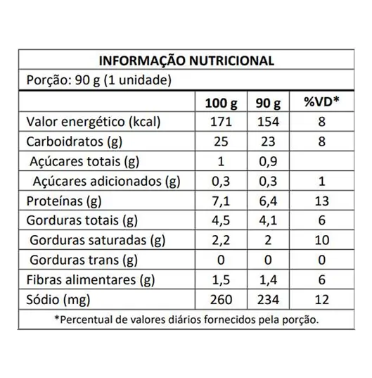 Tortilha de trigo (farinha de trigo enriquecida com ferro e ácido fólico, óleo vegetal de girassol, sal, açúcar, fermentos químicos bicarbonato de sódio e pirofosfato ácido de sódio, conservantes propionato de cálcio e sorbato de potássio, regulador de acidez ácido fumárico, emulsificantes monoglicerídeos de ácidos graxos), carne bovina, requeijão cremoso, especiarias (cebola, pimenta biquinho, alho, salsa, páprica doce, orégano, pimenta preta e louro em pó), vinagre, polpa de tomate, óleo vegetal de girassol, amido modificado, sal e corante extrato de urucum.